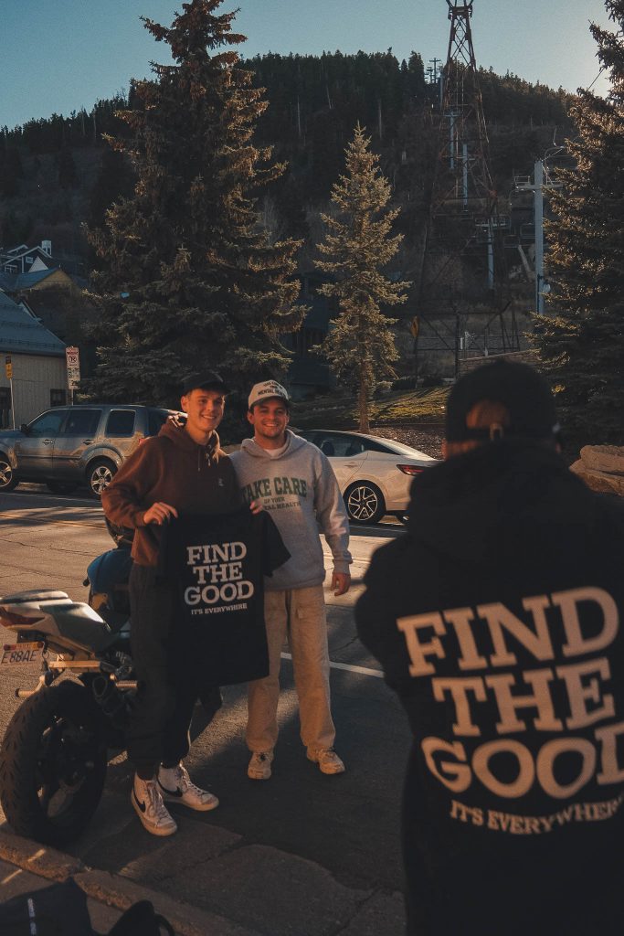 Later that day, we made our way to Park City for another community meetup and what had quickly become our version of a team dinner. As we settled in, we started talking with our waiter, Matt. Somewhere between ordering food and swapping stories, we realized he was already part of the Find The Good community. A follower. A customer. Someone who had connected with the message long before this trip ever existed. A free hoodie made its way across the table, followed by a quick photo to remember the moment. That is always our favorite part. The brand showing up where we least expect it.