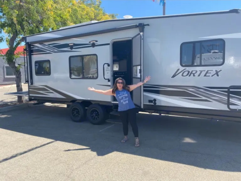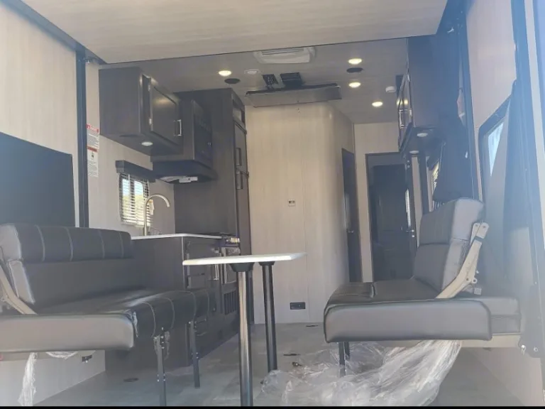 Private bedroom with queen bed and overhead storage, full bathroom with shower, sink, and toilet, air conditioning, and heating for year-round comfort, power awning for outdoors, shade and relaxation, comes with a generator, and fuel station to keep your adventures going longer.
