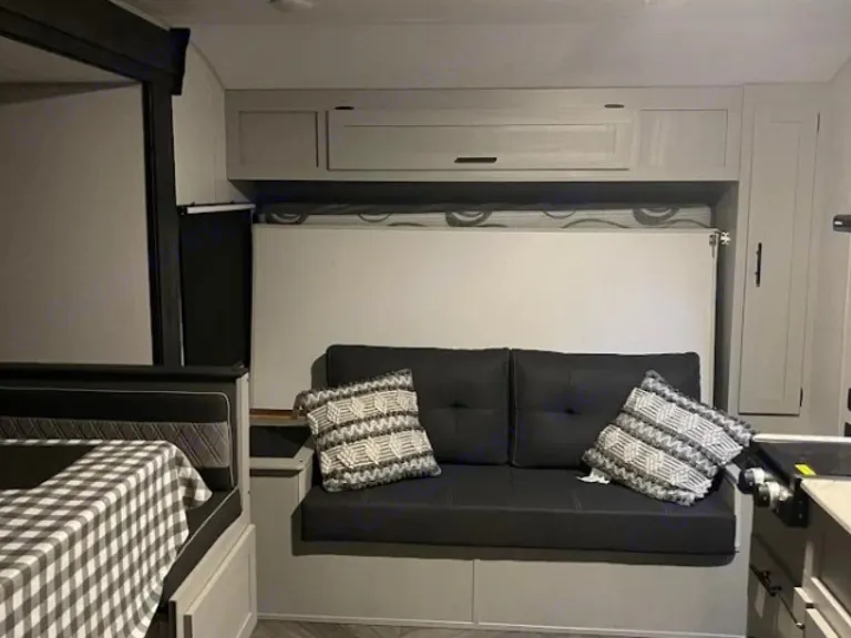 Light weight but still sleeps 8. Double bunks in back, very comfortable queen Murphy bed with topper that folds to a couch during the day and large slide out dining table that folds to a queen sized bed. Large refrigerator and freezer, Roof AC, USB Chargers, Exterior fridge and griddle. Power awning. Plenty of storage. Enjoy the great outdoors. Does not have a generator.