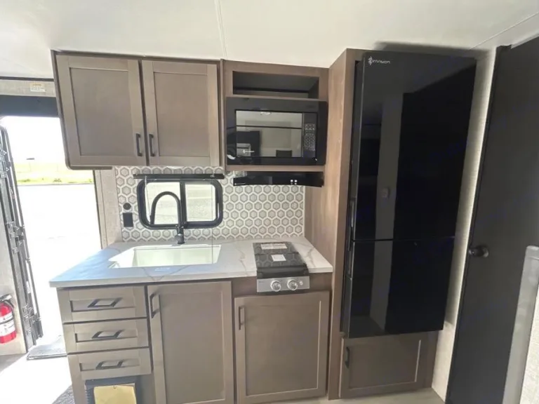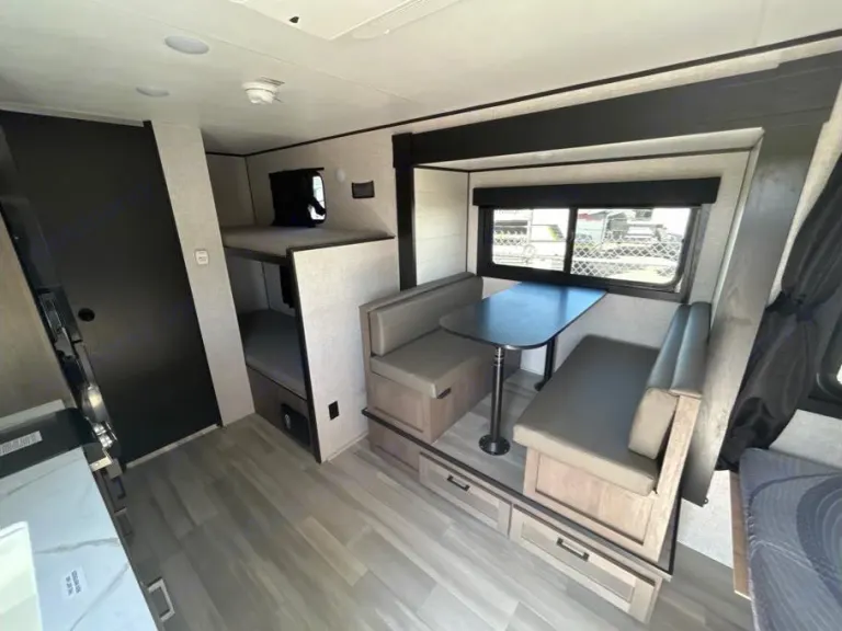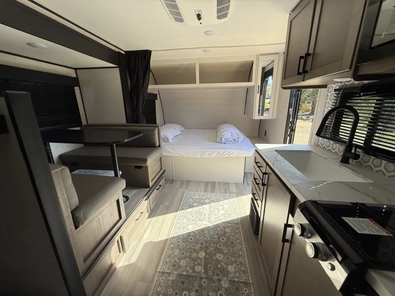 Hello, thank you for your interest in our 2025 Starcraft Autumn Ridge.This RV is super light, it can even be towed with a small SUV. Check your owners manual to make sure you are within the capability.When you walk in the RV youll see the queen size bed is towards the front, in the middle you have the kitchen and dinette that could convert into a bed if needed. Towards the back you have the bunk beds and there is the door to the bathroom and shower.You have plenty of storage inside the RV and an exterior accessed pass through storage towards the front under the bed.Some card games for entertainment at the campground, and some camping chairs.Qué incluyeIn the kitchen you’ll have plates, cups, utensils, pots and pans for cooking, a stovetop kettle and coffee maker.Clean bedding which includes bedsheets, pillows, and blankets, you can bring yours if you prefer to.Each booking will come with a full 20lbs propane tank, let me know if you’d need more than one for your trip.I can fill up the fresh water tank at no charge if you’re camping somewhere without access to fresh water.RecomendacionesRecommended camp grounds in SLO county:• Coastal Dunes RV Park