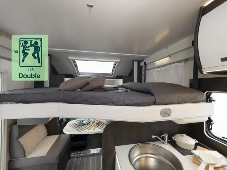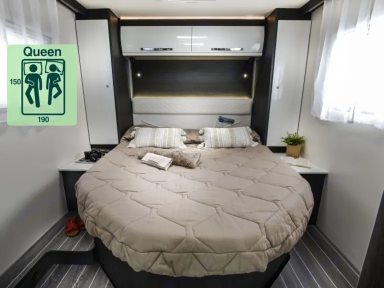 This luxurious four-berth motorhome features a rear island bed, complete with bedside tables and two wardrobes, ensuring ultimate comfort and convenience. The drop-down bed, easily stowed away during the day, maximises space for relaxation and entertainment. The popular L-shaped lounge provides seating for up to five people, making it ideal for family meals and quality time together.