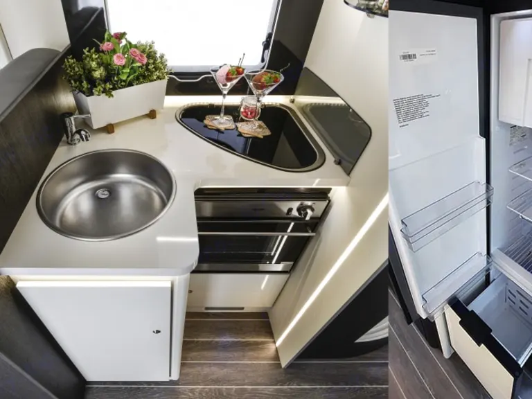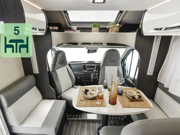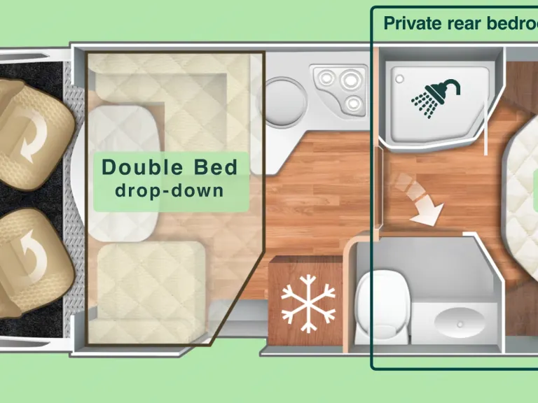 This luxurious four-berth motorhome features a rear island bed, complete with bedside tables and two wardrobes, ensuring ultimate comfort and convenience. The drop-down bed, easily stowed away during the day, maximises space for relaxation and entertainment. The popular L-shaped lounge provides seating for up to five people, making it ideal for family meals and quality time together.