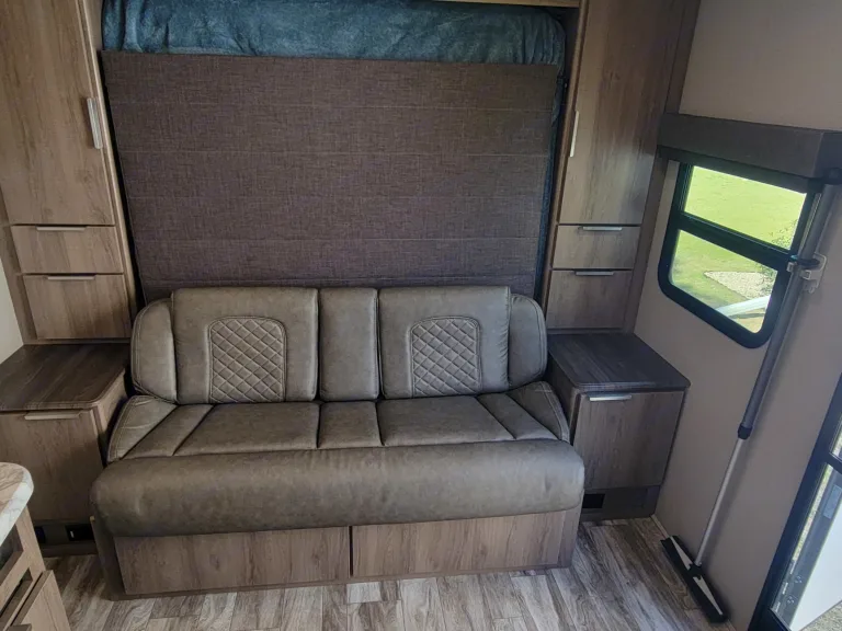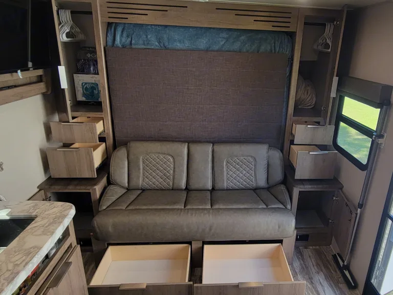 The 21BHE boasts a spacious interior that can comfortably accommodate up to 4 people. The open floor plan creates a sense of airiness and allows for easy movement throughout the trailer. The living area features a comfortable dinette that can convert into an additional sleeping space, making it perfect for families or groups.The kitchen in the 21BHE is well-equipped and designed for efficient meal preparation. It includes a three-burner cooktop, a microwave oven, and a large refrigerator, providing ample storage and cooking capabilities.