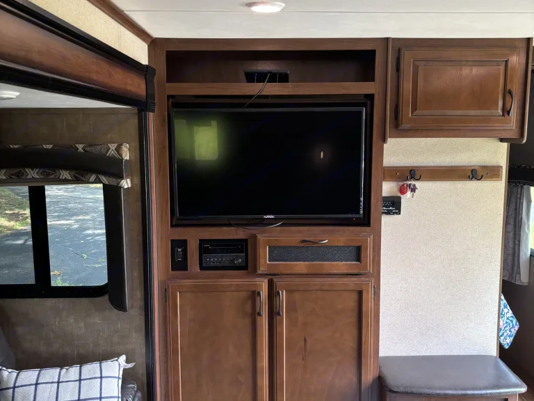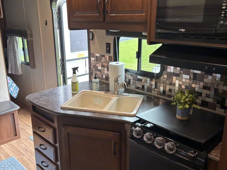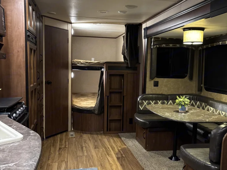 Escape in comfort with the spacious camper. Perfect for a family adventure or a friends getaway. Sleep up to 10 with a private queen, full sized bunks, a convertible dinette and a comfy sofa. Enjoy modern conveniences like a full kitchen, large fridge, and a roomy bathroom with its own exterior entry for easy access. This large open floor plan gives you lots of space to spread out and relax.