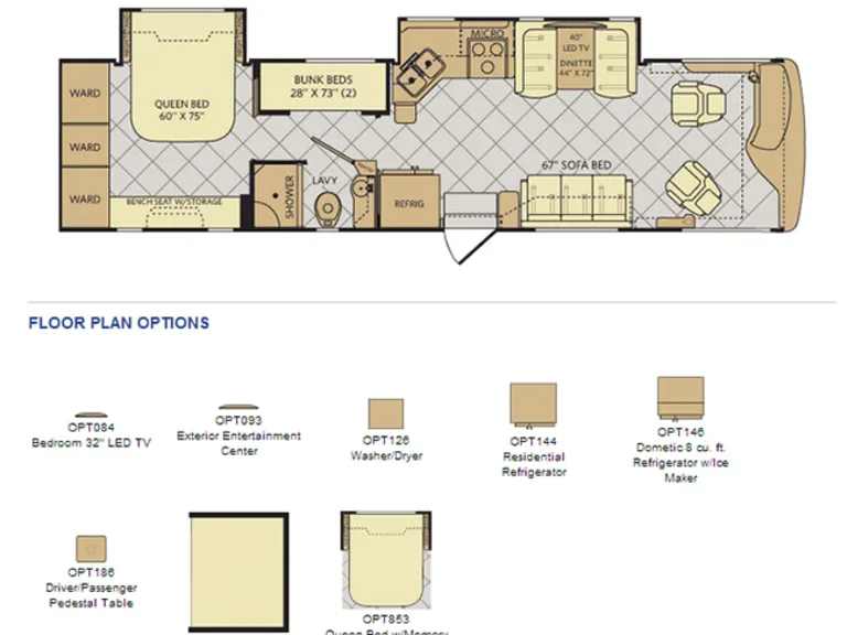 Advanced Comforts and Convenience: Features include power passenger and driver seats with footrests, dual high-efficiency roof-mounted A/C with solar pre-wiring, and optional Hide-A-Loft drop-down queen beds, perfect for extended stays or family trips.