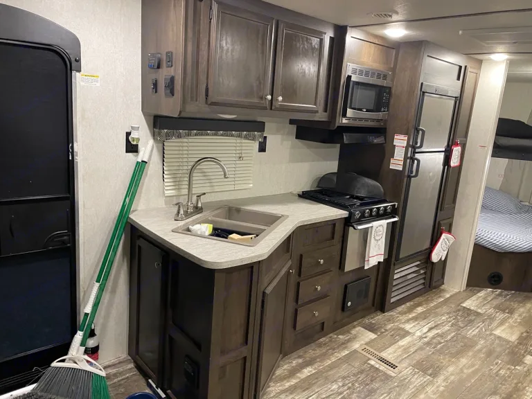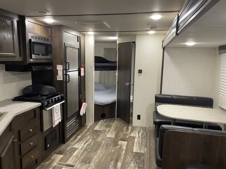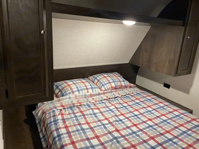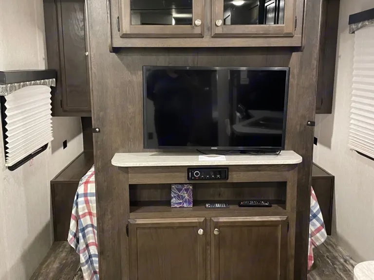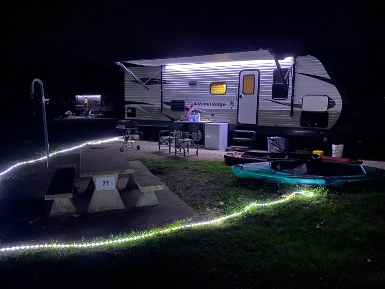 Get a great deal on our newer travel trailer camper rental, set up and ready when you arrive. Stocked with the essentials with kayaks rental add-on option. This RV sleeps 6 comfortably. Pet friendly. Check out a walkthrough video here: https://youtube.com/shorts/z7zACpRu6vg?feature=shareQué incluye* TV * Built in Stereo/DVD player with outdoor speakers* Pots, pans & kitchen utensils for cooking* Plates, Cups, silverware, coffee mugs