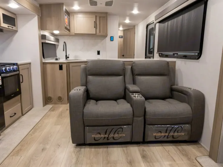 • A roomy rear living area with dual recliners, two plush sofas (convertible to a bed), TV and electric fireplace.