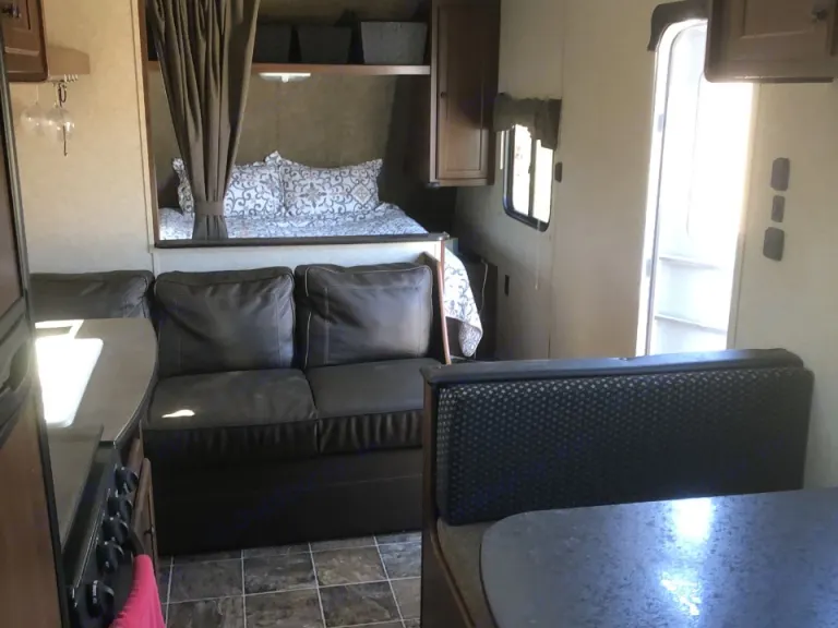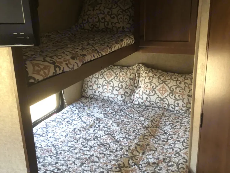 Comes with just about everything you need to tow and go..all dishes, silverware, keurig coffee maker all bedding and pillows except for fold outs (just bunk beds and master) outdoor carpet. and a power awning system. Has power stabilizing system to make set up easy and quick. Camper IS NOT Self Contained, IT Needs Plug IN Power FOR Everything TO Work Properly.Qué incluye• Lawn rug, coleman portable grill, tv, stereo and a keurig coffee makerRecomendacionesbring your own folding /beach chairs,. and anything extra you might want to bring like bikes etc Otros detalles importantesMemorial day, and Labor day will be a minimum of 5 day rental .4th of July will be minimum stay of 7 days. please dump the tanks before returning camper ..hook-up to sewage if possible. if not there will be a $100.00 cleaning charge for dumping tanks.