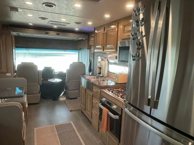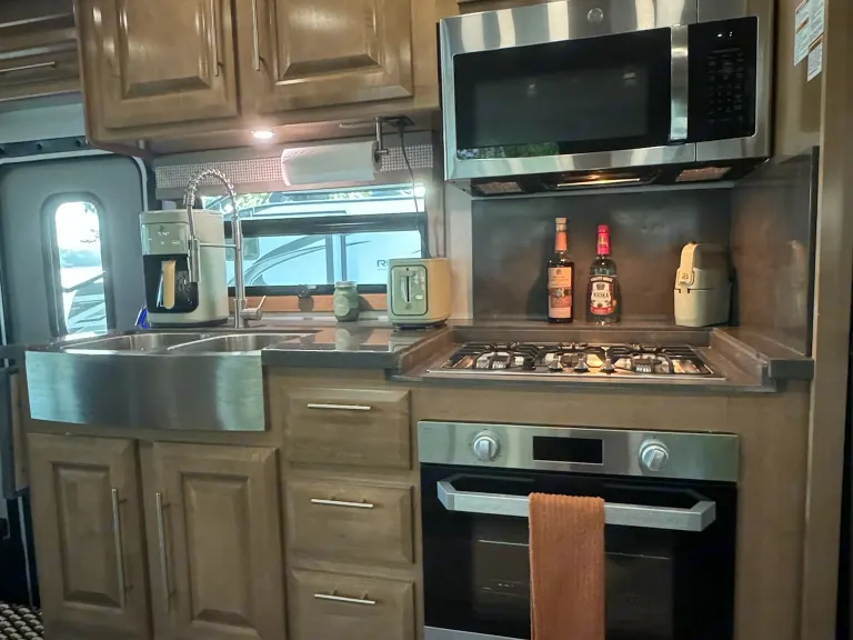 40’ 3” Class A Luxury Motorhome.Sleeps a family of 6 (without conversion) or 8 (with some conversion of the dining area), King Bed w/Overhead Storage, night stands, drawers & Wardrobe, 2 Bunks, front electric pull down full size bed, 2 full bathrooms both with showers, Washer and Dryer, Electric Fireplace, Residential side-by-side Refrigerator, 3 Burner Range w/ oven and a Microwave Above, Dbl Kitchen Sink, 3 TVs, Outside Power Awning, Auto Power Stabilizing jacks, 2 ACs, Furnace (heat), onboard Generator, Lots of storage, and Much More!The unit will include basic cooking utensils, a pot, a pan, silverware, paper-towels, 4 plates & bowls, 4 cups & mugs, dish soap, bathroom tissues, hand-soap, air fryer, coffee maker (ground coffee), cutting boards, knifes, can opener, vegetable oil, salt, black pepper, trash cans, broom/dust pan.