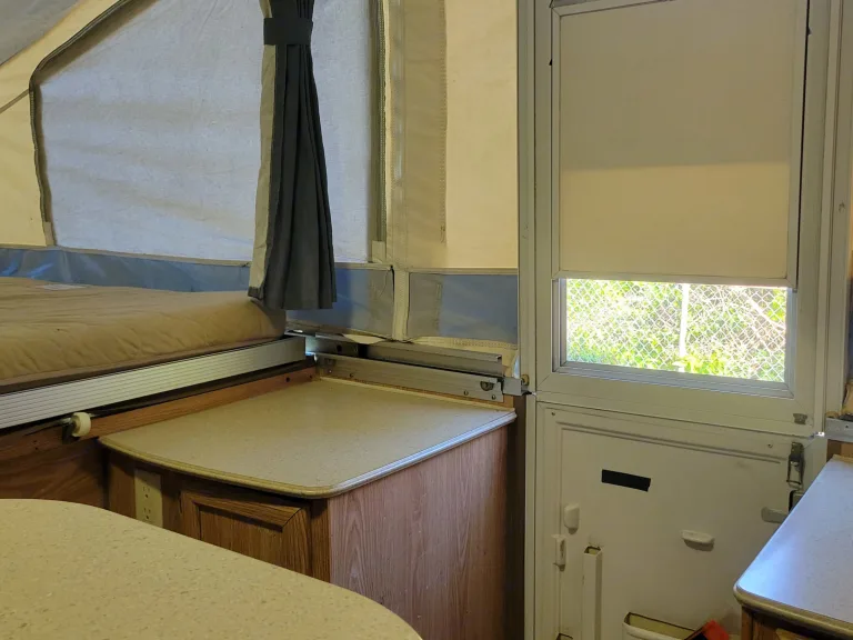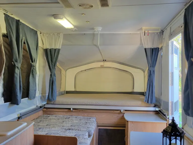 This cozy little pop-up camper is a great choice for a small family or couple that enjoys the outdoors and the feel of tent with camping with the benefits of a dry and comfortable place to sleep