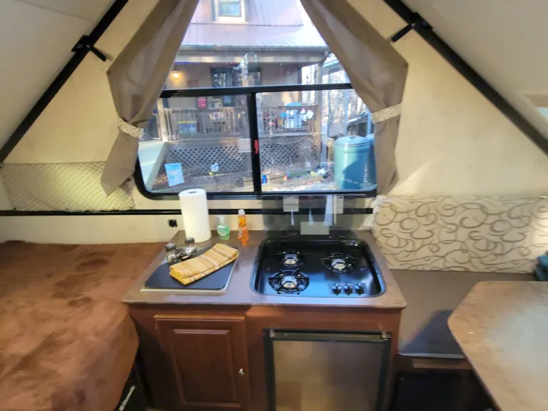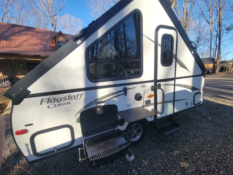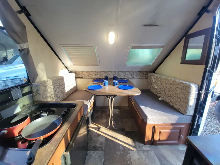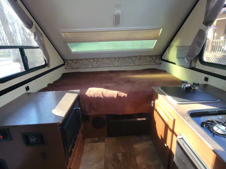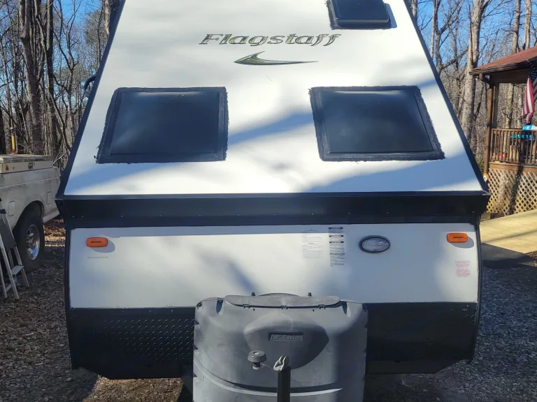 2015 Flagstaff 12RB A-Frame. It has a queen bed, small dinette that makes into a full size bed, small kitchen with sink, microwave, and 3 burner stove. A/C and heat, water heater, with an outside shower. Outside gas grill with small table.