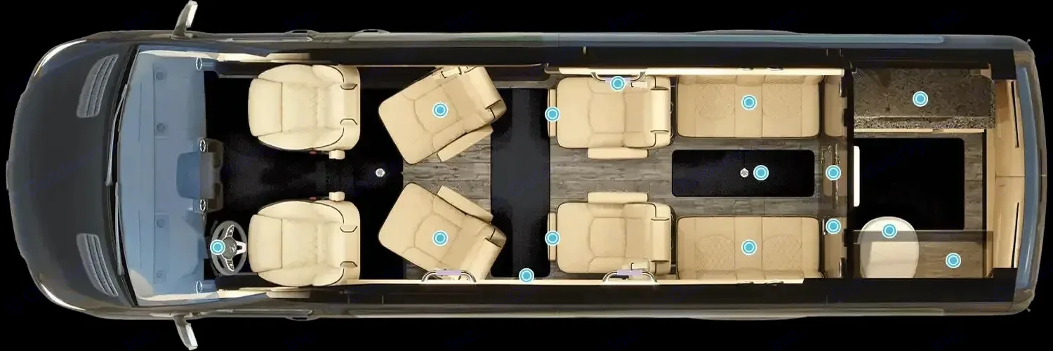 Pull up, turn on the outside speakers, and your setup becomes the center of the tailgate.Bathroom & Interior AmenitiesUnlike most Sprinter rentals, this coach includes: