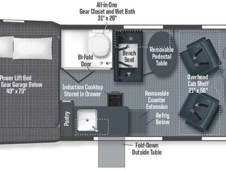 • Heated Gear Garage: The massive rear garage is perfect for stowing muddy hiking packs, mountain bikes, or a fall paddleboard—complete with a wet-storage area to keep the cabin pristine.5Fully Stocked for the TrailForget packing cookware, bedding, or camp chairs—we've handled everything. This Revel is stocked with premium gear to make your basecamp life effortless: