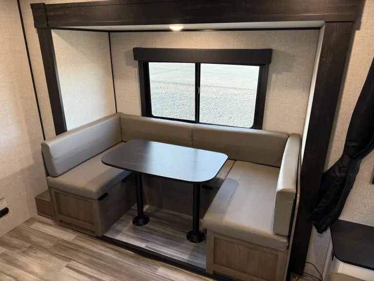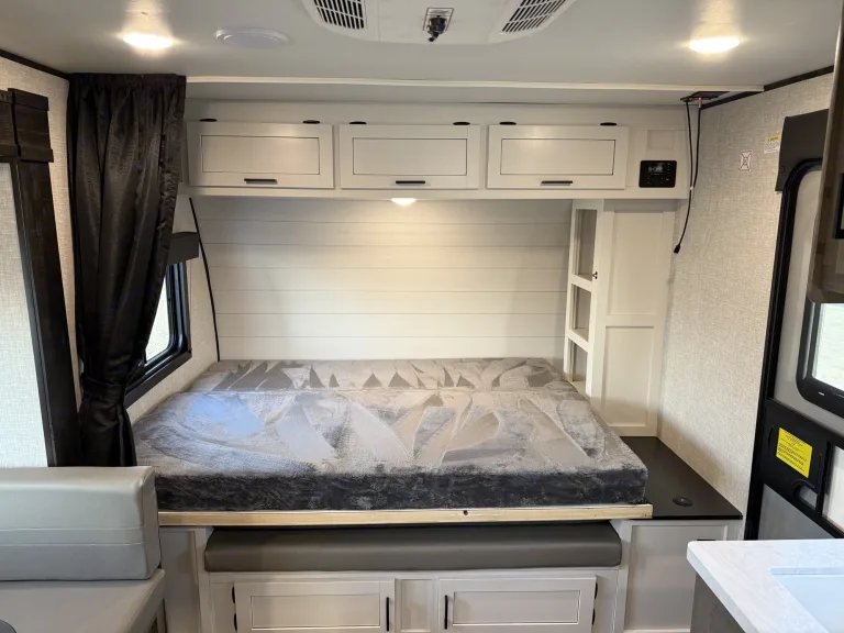 Load up the whole family and head to your favorite campground in this travel trailer! It offers versatility with the front 60" x 76" Murphy bed which transforms into a sofa for seating during the day. There is also a set of double-size bunk beds for the kids to sleep on and the U-shaped dinette can transform into an extra sleeping space when you're not using it. It also has solar to help keep the batteries charged.