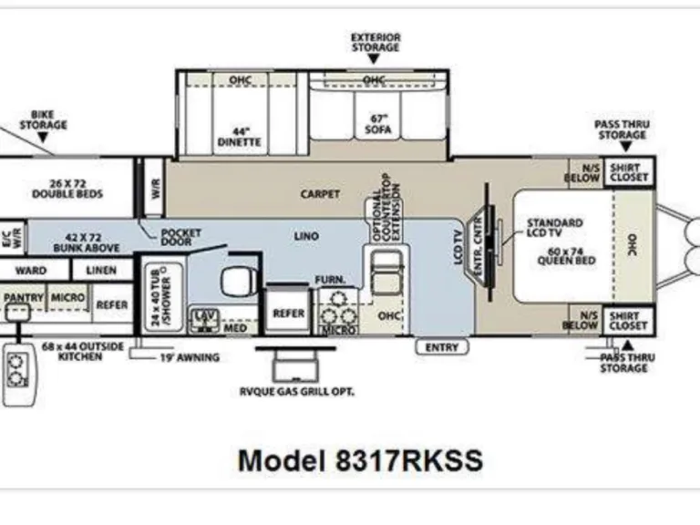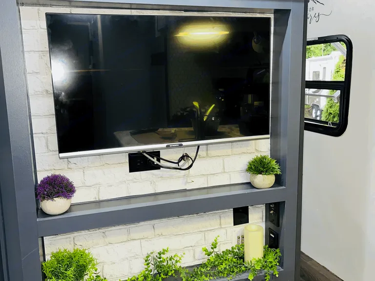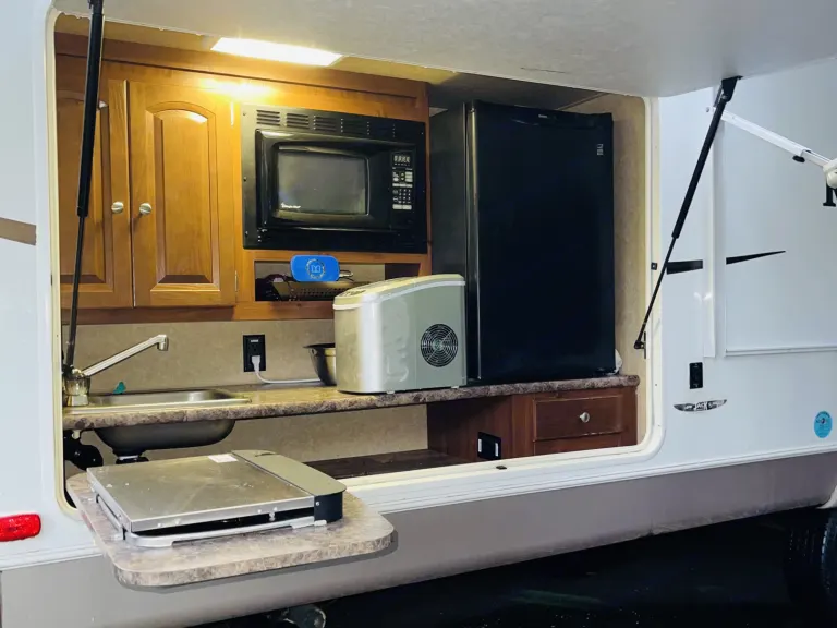 This home away from home comes complete with all the cooking comforts of home- perfect for making drool-worthy meals! Outside, it’s complete with an electric awning and outdoor kitchen, store your cold ones in the outside fridge for easy access!