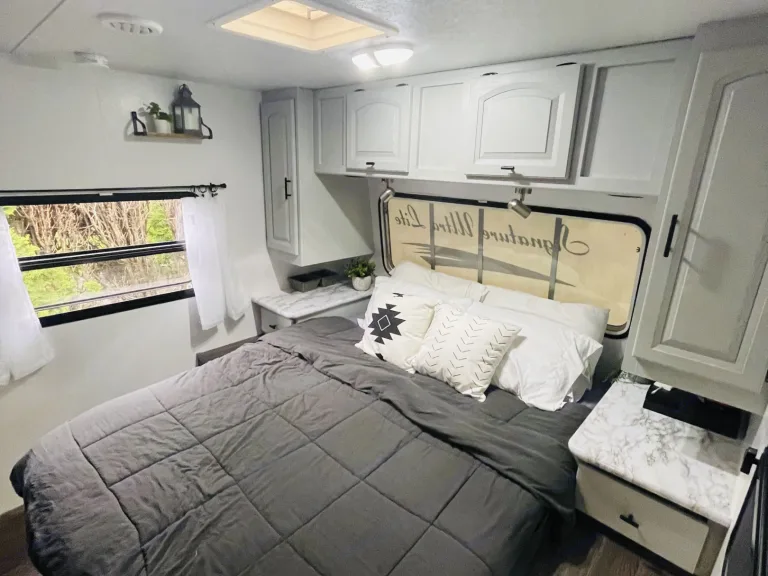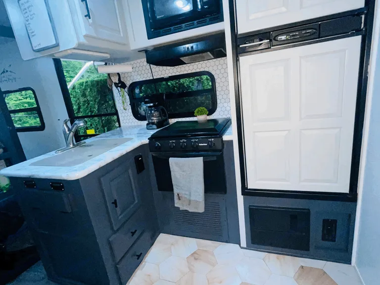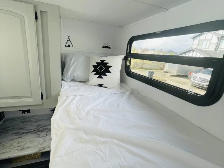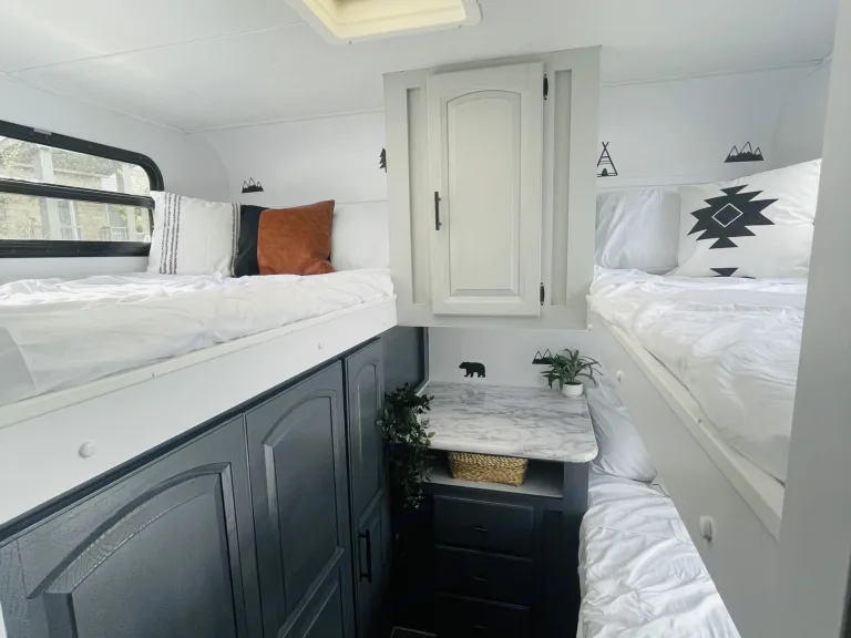 Our 2014 33’ Rockwood has been fully remodelled to make your camping adventure feel just as cozy as home! This custom finished modern farmhouse style conversion comes fully equipped with a queen size bed in the front, 3 bunks in a separate bunk-house in the back (perfect for a family with lil muchkins or an adventure with friends), as well as a pull out couch for a lil extra sleeping room.