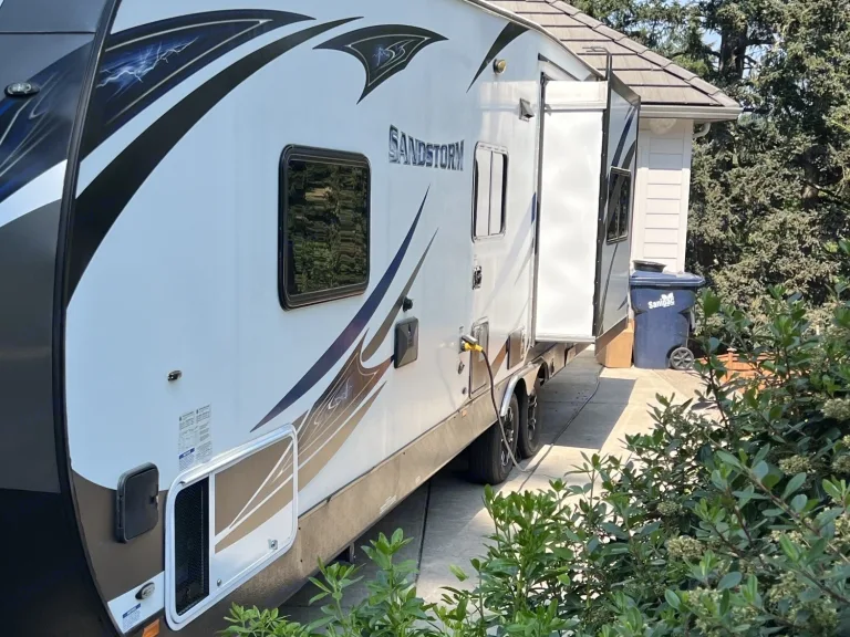 This 30-foot Sandstorm toy hauler has everything you need for an unforgettable camping experience. Designed for comfort and convenience, it sleeps up to five people comfortably and comes equipped with all the essentials for a perfect getaway.Stay cozy in any weather with built-in heating and air conditioning, and enjoy the convenience of a fully equipped kitchen featuring a microwave, oven, refrigerator, and everything you need to prepare delicious meals. A generator ensures power wherever your adventures take you, and with two TVs onboard, entertainment is always within reach.Whether you're hitting the road for a weekend escape or an extended adventure, this Sandstorm toy hauler is ready to take you there in comfort and style!Qué incluye• Bedding