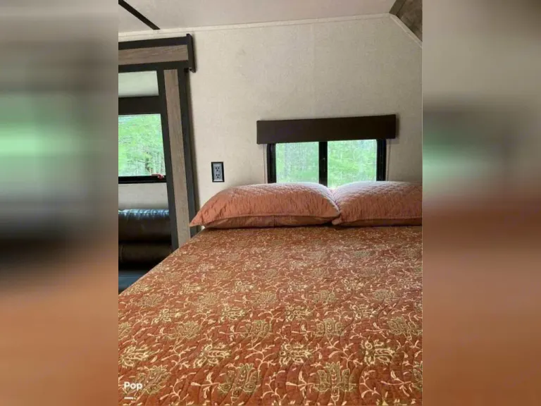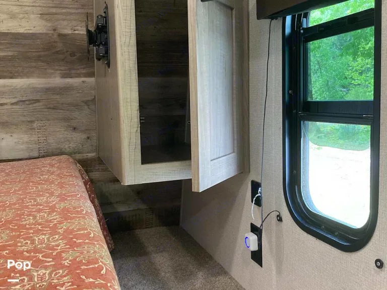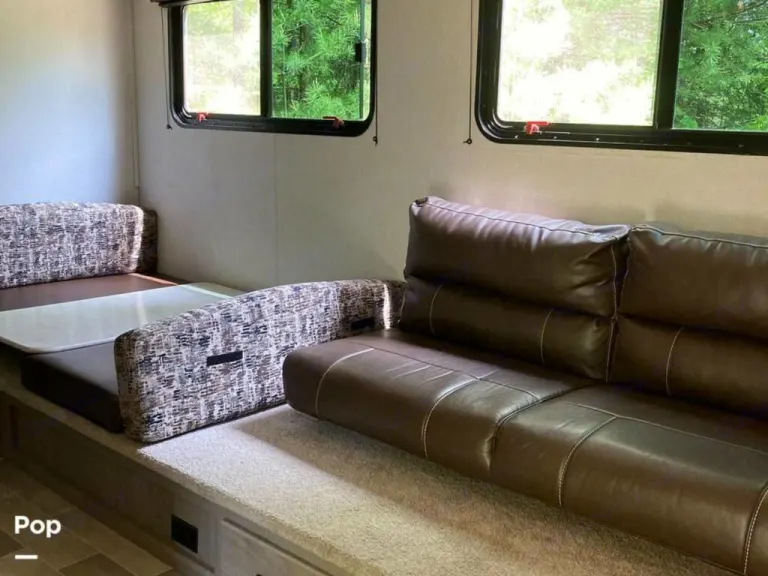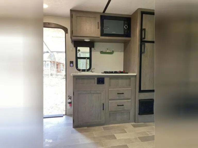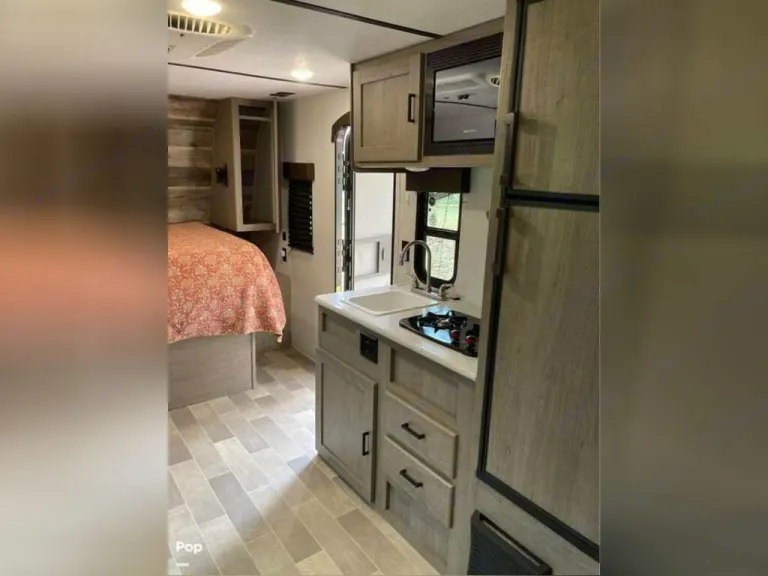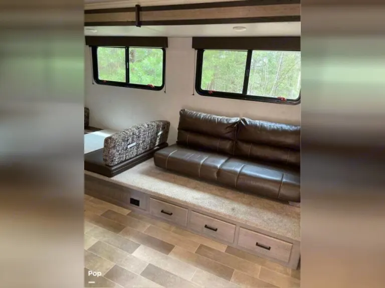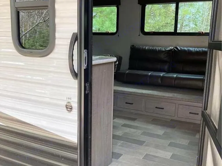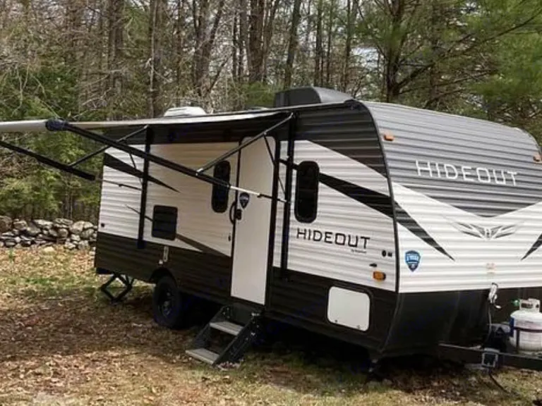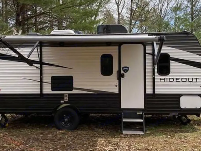 Abundant storage throughout makes this Hideout Single Axle unit easy to keep organized! You will love the exterior pass-through compartment up front for all of your outdoor camping gear and yard games. With a 10' power awning, you can enjoy the evening playing corn hole and roasting marshmallows over a campfire. When inside, there is plenty of space thanks to the large slide which features a booth dinette and jack knife sofa, and both seating spaces offer storage drawers below.