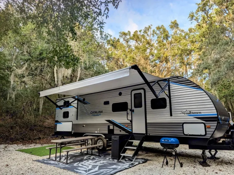 Stationary camper located at the Amelia River Campground inside Fort Clinch State Park. Fort Clinch is located in Fernandina Beach on beautiful Amelia Island.