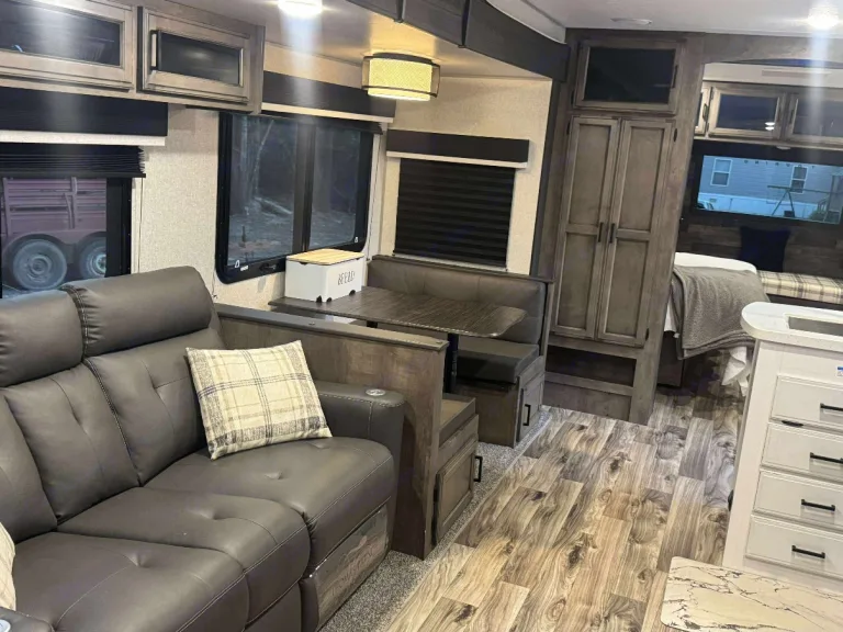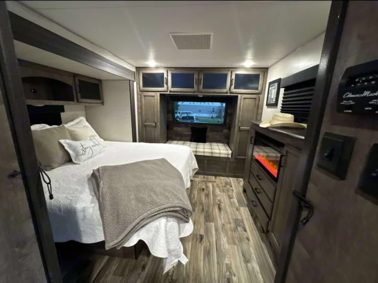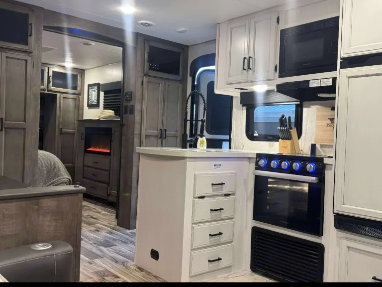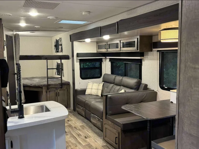 2023 SportTrek Touring Edition 312VBH – Luxury Family Bunkhouse CamperOur 2023 SportTrek Touring 312VBH is fully loaded and ready for your next adventure! Sleeps 8–10 with a king bed, double-over-double bunks, theater seating, and a convertible dinette. The interior has a modern farmhouse design with fireplaces in both the living area and bedroom, a 50” smart TV, and plenty of space thanks to 2 power slideouts.The kitchen comes fully equipped with a 10 cu. ft. refrigerator, 3-burner stove with oven, microwave, stainless appliances, and a large sink with cutting board and drying rack. You’ll also enjoy the full bathroom with shower plus an outdoor hot/cold shower.Other features include a 20′ power awning with LED lighting, central heat, dual A/C units (15,000 BTU & 13,500 BTU), insulated underbelly, backup camera prep, outdoor shower, and tons of storage.Specs: 35’9” length, 11’4” height, 7,980 lbs dry weight, 9,340 lbs Gvwr. Fresh water 45 gal, gray 32 gal, black 32 gal.