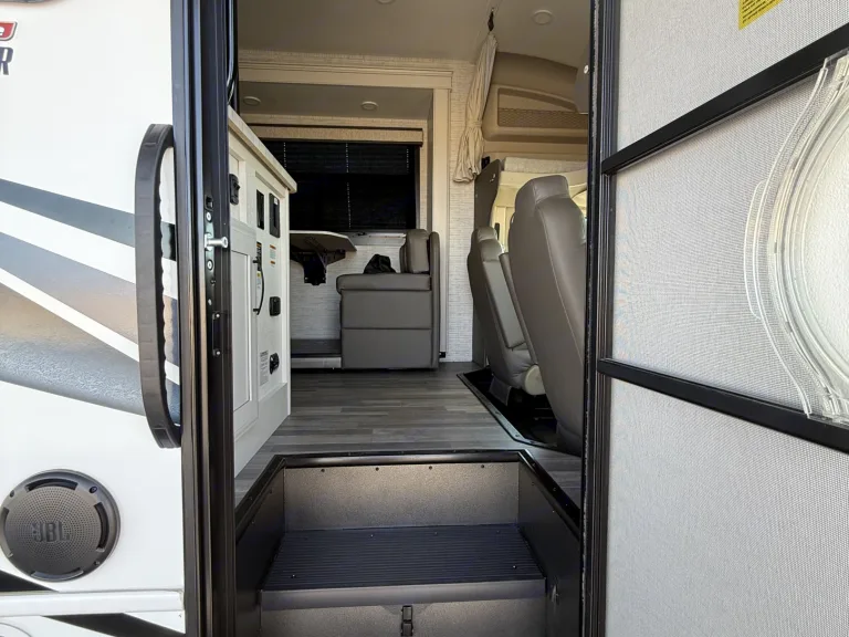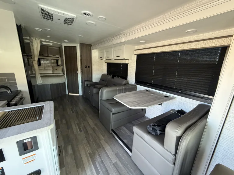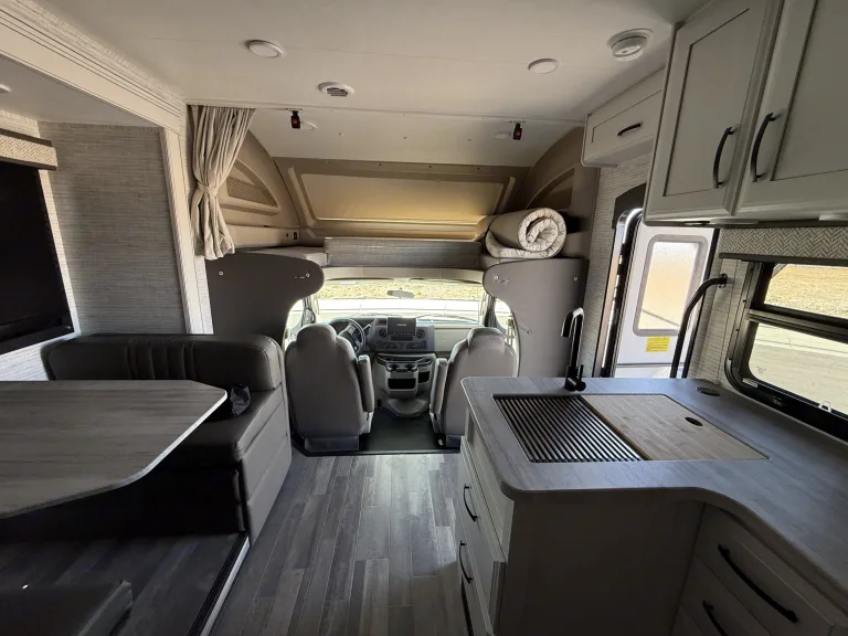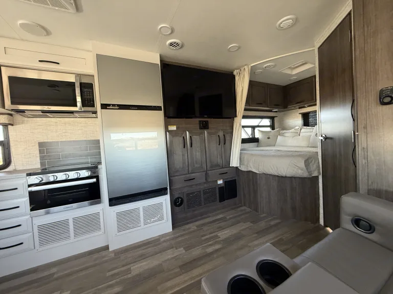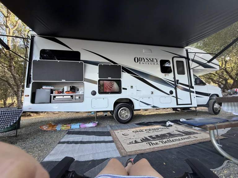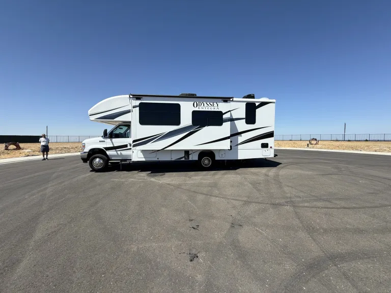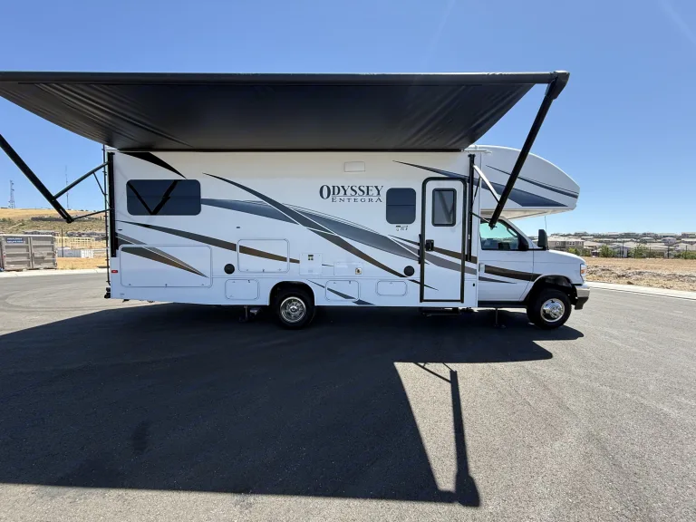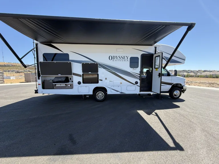 Hit the road in this brand new rig. Our 2025 Entegra Odyssey features a modern farm house design equipped with one super slide, kitchen with microwave, stove/oven, one queen bed, a queen over the cab bunk with custom topper, a large 12v refrigerator, two manual recliners, which can be used for sleeping, outdoor kitchen with frig, 2 burner stove and sink, 2 smart tv’s (50” interior and 32”exterior), 18’ power awning, hydraulic auto leveling jacks, 2 Queen beds, a convertible dinette.. Has 8 seat belts with child seat restraints in the dinette. 200 watt solar. Full side and back up camera system. JBL indoor/outdoor entertainment speakers. Qué incluyeWe include everything you need for great experience from…