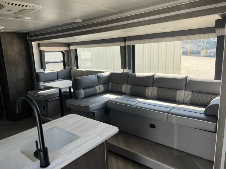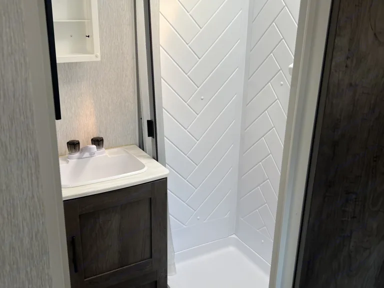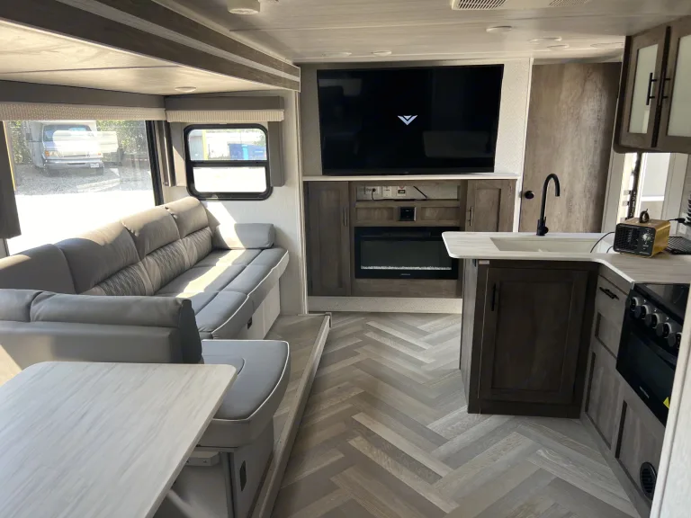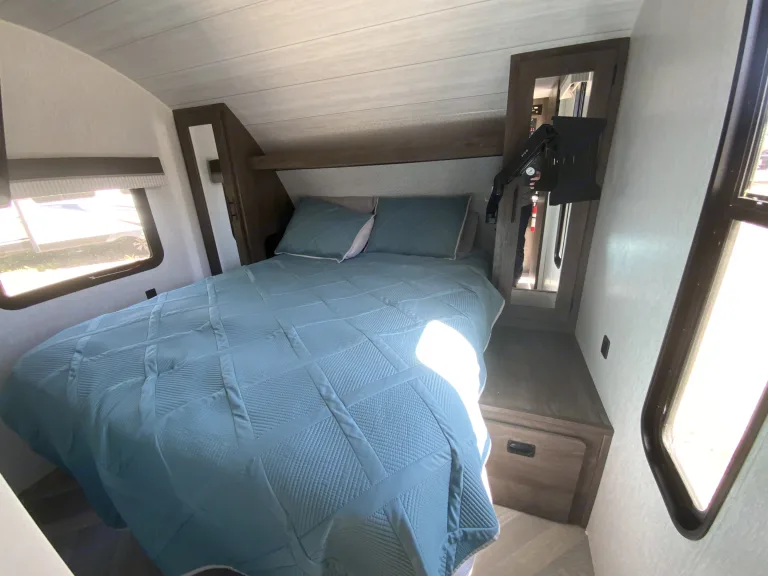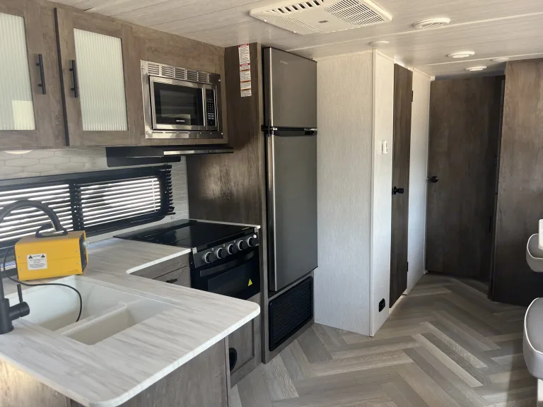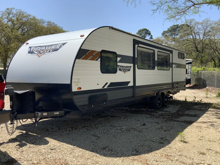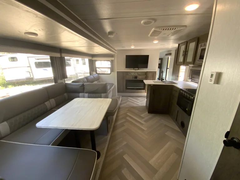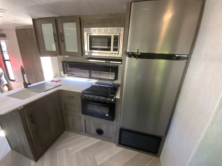 The Wildwood X-Lite is your perfect home away from home on the road! You'll love the front bedroom, where a comfy queen bed is all set up and ready for a great night’s sleep. The kitchen is stocked with all the essentials, so you can easily cook up your favorite meals without a hassle. The living area features a cozy couch and a table that both double as extra sleeping spaces if needed. The bathroom comes fully stocked with everything you’ll need, so you can feel at ease during your trip. If you’ve got kids or need more space, the bunk room is perfect with two ready-to-go bunks and a couch that folds out into a bed. And for those sunny days, the outdoor kitchen is ideal for cooking and enjoying meals under the open sky. Whether you’re heading out for a family getaway or a friends’ trip, the Wildwood X-Lite has everything to make your experience comfortable, fun, and stress-free!