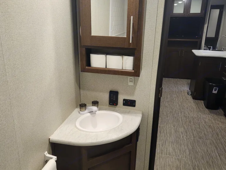 The trailer also includes a full bathroom with a large comfortable shower, sink and toilet, so you can freshen up after a day of adventure.