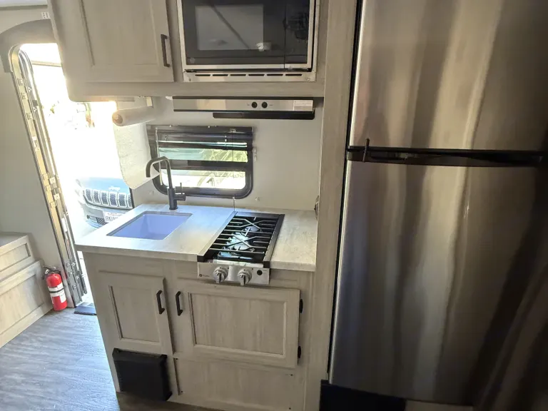 Be our guest! Be our guest! Put our service to the test! You will love my spacious 2025 Forest River Aurora, for a quick getaway or an extended visit to the surrounding areas. It has an electronic tongue jack and back up camera. It comes with a queen bed, a dinette conversion double and two double bunks. This trailer has a shower with a sink in the bathroom. It also has it fully stocked kitchen, heating and air. I provide bedding upon request. It comes equipped with solar, however I provide a generator for dry camping. A great feature of my trailer is the outdoor kitchen, including a cooktop, small refrigerator and cabinet space. Pick up and drop off times are negotiable. You will love it!Qué incluyeThe kitchen is stocked with basic Utensils, paper plates and napkins, pots and pans. I also supply some seasoning and oil.