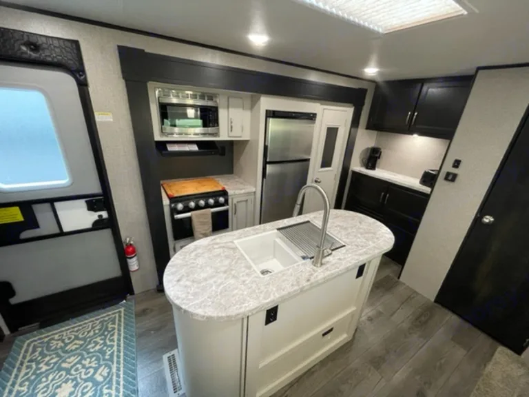 Linens, towels are provided, bundle consist of : {4 x fitted sheets, 4 x comforters, 5 x pillows & pillow cases, 5 towels, 5 wash cloths}The kitchen is equipped with a island with a undermount sink. The microwave, refrigerator, oven, and stove are all part of the slide. The dinette area has a U shaped