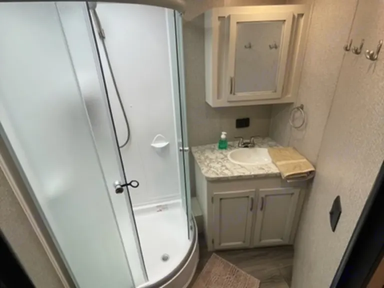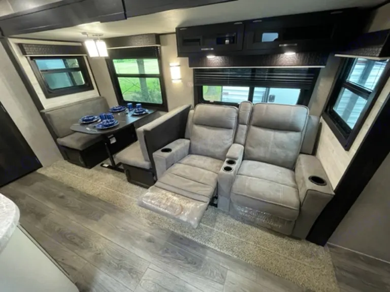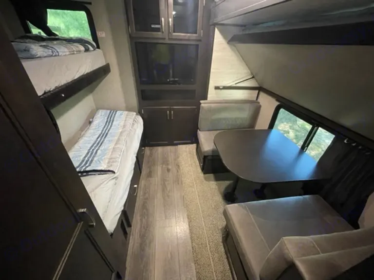 seating area that can convert into a full size bed.The dinette and the recliners are all part of the slide out of the unit. When the slide out is "out," it opens the unit up so you have plenty of room.This unit has a separate bunkhouse with 3 single bunks and a dinette that folds to be a single bed and has its own roku tv..In the front of the unit is the bathroom, which is equipped with a corner shower, a foot-flush toilet and a wash hand basin.The travel trailer comes with a electric awning.Delivery and setup is available for a fee.---- For insurance purposes the vehicle is equipped with a GPS tracking device. Tampering with or removing this device will result in immediate forfeiture of the entire damage deposit.3/4 TON TOW-Able, Your Vehicle Must Have A Brake Controller.
