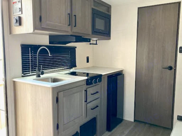 Compact full galley kitchen equipped with a 2‑burner cooktop, microwave, and 3.3 cu ft glass‑front 12 V refrigerator