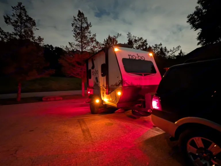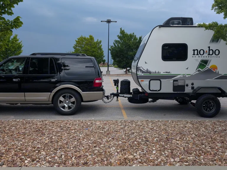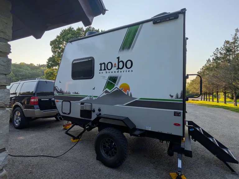 This NoBo features independent suspension. This means it handles gravel and bumpy backroads much better than standard trailers. When taking turns, 'swing wide' to give that suspension plenty of room to clear the curb. Make sure door is closed all the way and locked, make sure awning is retracted and do a once or twice walk around before towing the trailer. Turn off inverter if you don't need the 110 power for the outlets, my pressure and holding the power button.