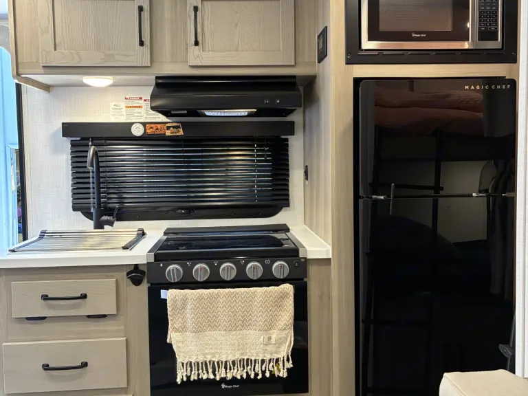 This 2024 Forest River Rockwood GEO-PRO 20BHS is a light travel trailer. Camping with family or friends should be a breeze with 1 queen, 2 bunk beds and a dinette that turns into a bed. The TV is a smart tv that can be hooked up for streaming. The bath area has a toilet, tub/shower and folding sink for washing that is available. The kitchen is equiped with oven, microwave, stove, and fridge as well as utensils, cookware, stainless steel plates and bowls ready for a good meal to be cooked-up.If weather is nice, within the exterior storage, 3 camping chairs and foldable picnic table/chairs can be found with a griddle that can be enjoyed outside by the 14' power awning. It also has a bike rack available upon request for those looking to ride during their camping. The camper runs on 200W solar panel and a 1800W inverter (2 deep cycle batteries) to go have some off-grid fun with!Qué incluye• Bed linens