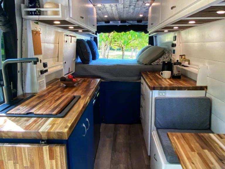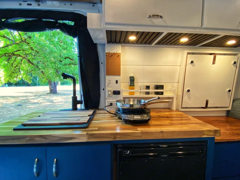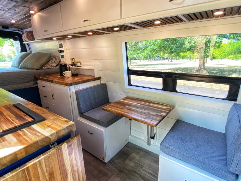 Soak UP THE Views IN Vista!Vista is a gorgeous, custom built Freightliner Mercedes Benz Sprinter that will get you wherever you want to go in style and comfort. With one of a kind touches and the latest technology, this picture-perfect van has everything you need to feel like you’re at home on the road.Vista seats two and sleeps two on the expandable queen mattress. If you need to sleep three people, an additional child or smaller adult can sleep on the fold-down dinette. This space can also be used as a comfortable couch and linens are included in your rental, so packing will be a breeze.Everything you need to cook your favorite camp meals is included in Vista’s stylish and fully stocked kitchen, including a refrigerator, French press, low voltage toaster, waffle maker, induction cook top and hot water kettle. Get ready to take lots of photos of the custom-built cabinets, made with reclaimed wood from a midcentury home remodel.Some of Vista’s many amenities include:- Dining table