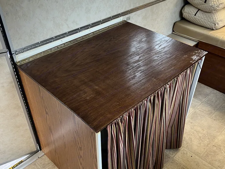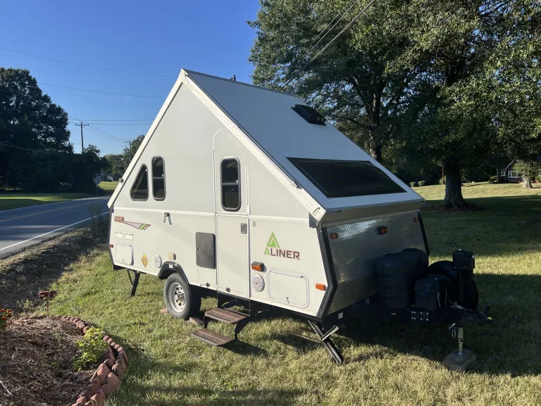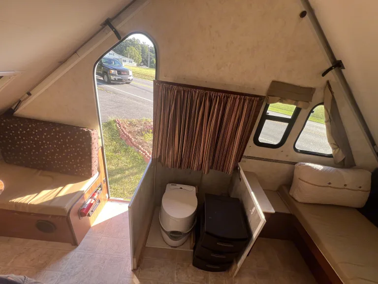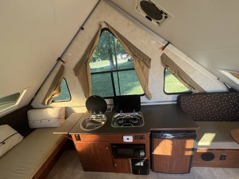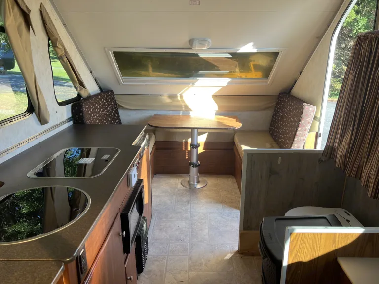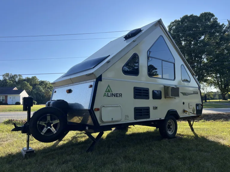 This light weight pop up camper has only hard walls, no canvas to deal with. The Expedition is the premium model and comes with air conditioning, gas stove, sink, refrigerator (gas or electric) and also has a porta potty inside!The dinette folds down to a 48" wide bed and the sofa on the other end is a full size 54" bed. There is a skylight above each bed so you can watch the stars go by when you settle down for the night.Putting the top up and down on the Aliner will take some practice, we will show you and make sure you are comfortable before you leave. The great part is that because it is such a low profile, it makes towing the camper a breeze and does not kill your gas mileage like the full size travel trailers.Qué incluye• The camper has everything need to set up, chocks, leveling blocks, it will have a full propane tank and all of the electrical cords to hook up at your campsite, with either 30 amp or 20 amp outlets.Otros detalles importantesNo smoking or vaping inside of the camper please and if you have pets please cover the cushions with a thick blanket so their nails don't tear the fabric, thank you!
