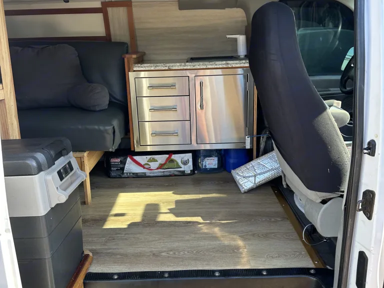 In the inside, you can find the kitchen sink set up with everything you need to cook. Also, the lay out of the van is made for extra storage and have a comfortable counter. In the roof there’s a fun set up that works as an extractor and as a fan. It is designed with a rain detector so in case the fan is open, this will automatically close.