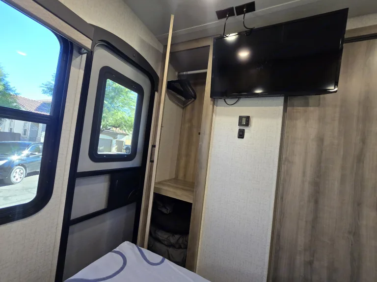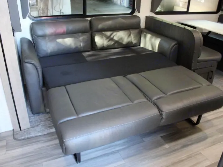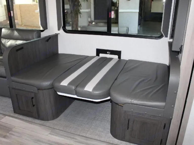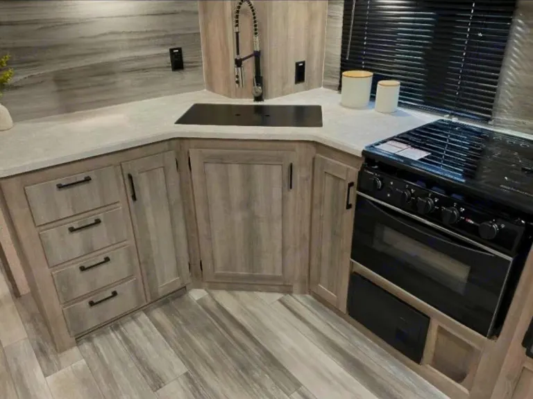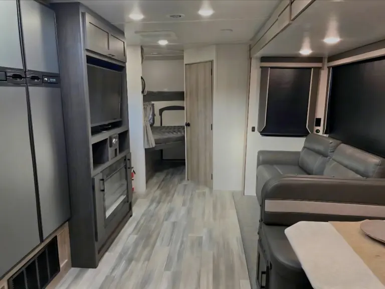 Bring the whole crew—this spacious Voyage 3033BH comfortably sleeps up to 9 and is built for four seasons of family fun. Setup is a breeze with power stabilizers, and everyone will love the outdoor kitchen for easy meals under the awning’s LED glow. Inside, enjoy large windows, bright LED lighting, and ductless flooring made for real-life messes. The full kitchen features a recessed 3-burner cooktop, convection microwave, and a 12V fridge to keep everyone fueled. Relax with a king bed, cozy bunkhouse, and a living area that feels like home.