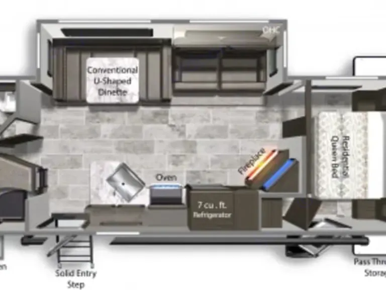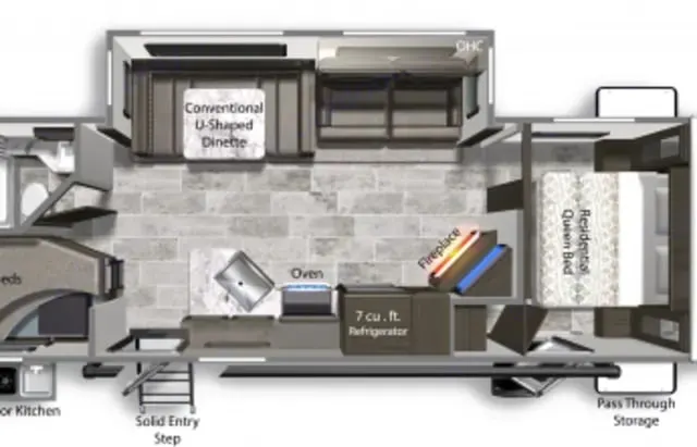 Glass Fireplace w/BTU Heater: For when you want to feel fancy and warm.- Storage and Convenience -Tons of Storage Under Queen, Sofa/Bed, Kitchenette, and Bottom Bunk
