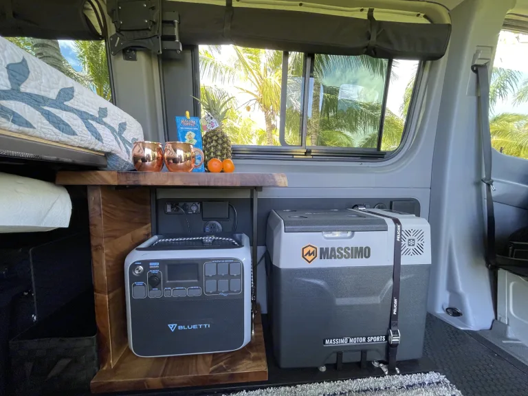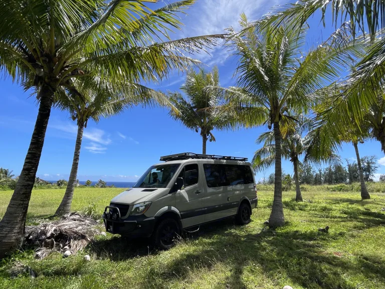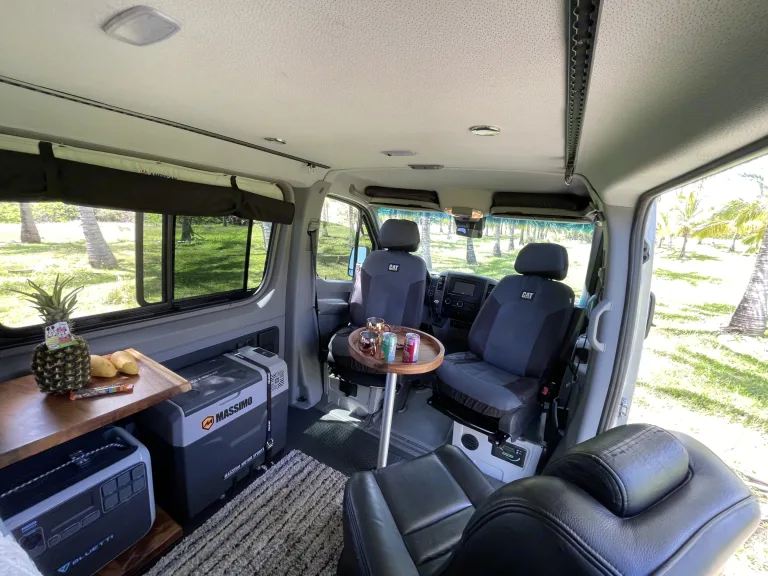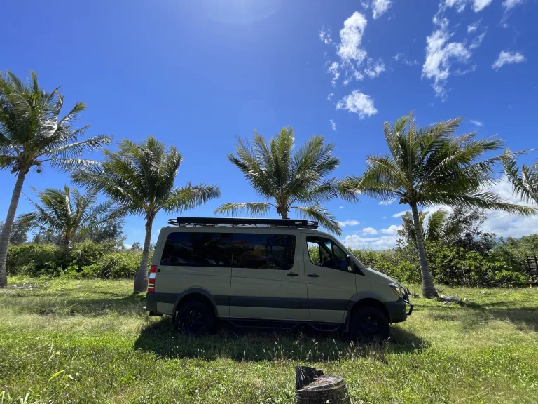 The Island Grizzly Bear 4x4Explore and see Kauai in style above all vehicles with large windows for a panoramic view along the way. Rare 4x4 Sprinter Camper Van in Kauai. Great sound system with Apple Play. 3 Custom leather seats that all swivel. Lifted/kitted with everything you need and ready for anything.Van is equipped with USB and DC ports throughout, Light Bar, Huge Bed, 50L Fridge/Freezer, Bluetti 2000W Power Station (AC /DC / USB), MaxxFan Deluxe, solar, screened windows, huge cargo area with tie downs for luggage, shortboard storage under bed and much more.Perfect sized camper to explore this island with very few if any limitations. 3rd rear seat can be added upon request for parties greater than 2. Van has more space without 3rd seat. Qué incluyeGrizzly Equipped with Following:- Huge comfy 76” x 76” Bamboo Platform Bed w/6" Memory Foam