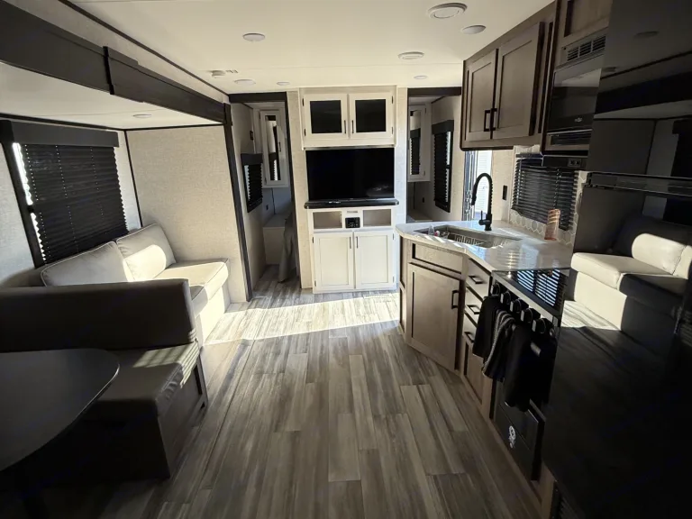 -Ample Storage: overhead cabinets, under-bed compartments, and an exterior pass-through storage area.