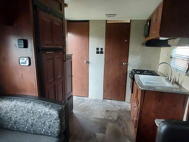 The 25TSS is a great unit for a couple or small family. The 25TSS has an open floorplan with a front walk around bed (with privacy curtain), center sofa slide with an adjacent dinette (both collapse for additional sleeping space. The kitchen is in the back of the unit and across from the rear entrance door. The bathroom is in the back of the unit and has a rear wardrobe for extra storage. The awning is electric for easy set-up.