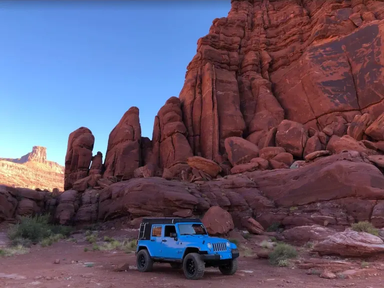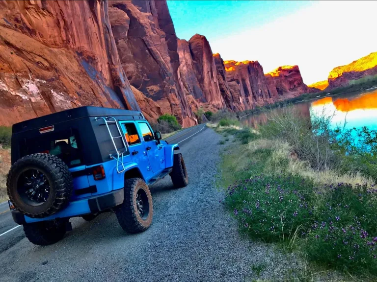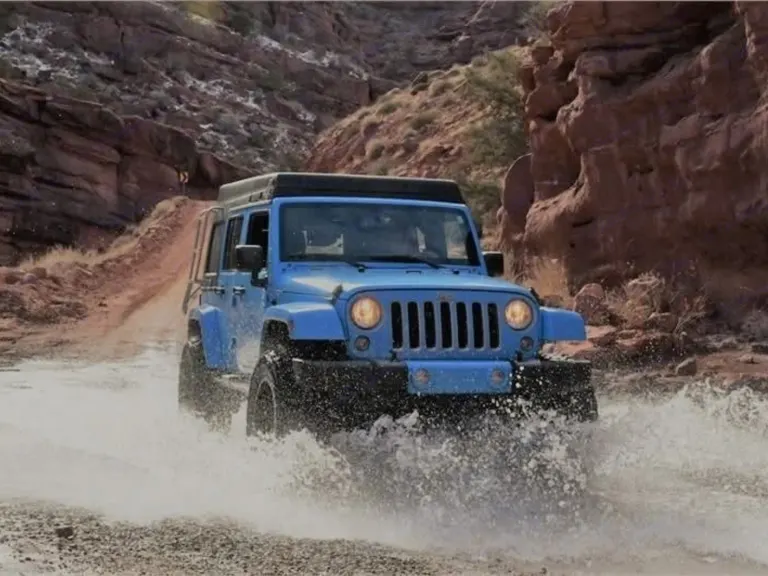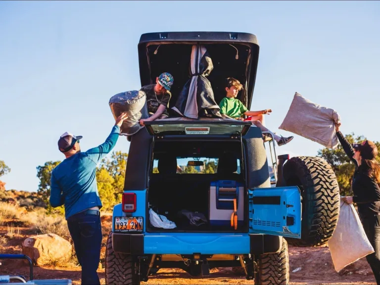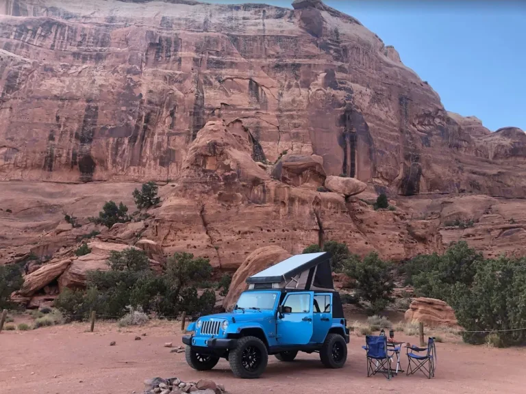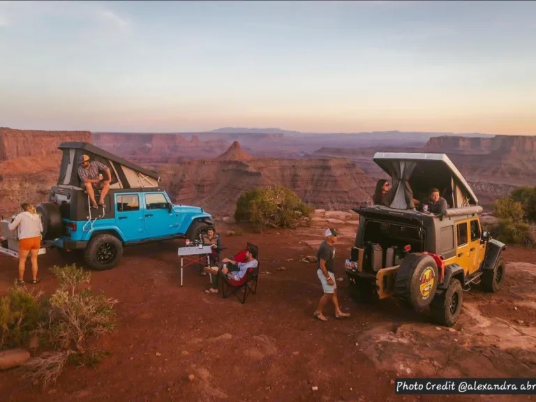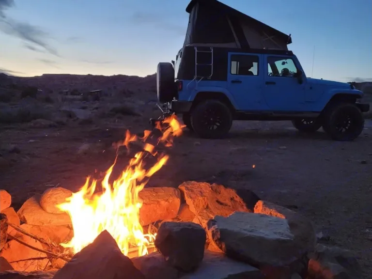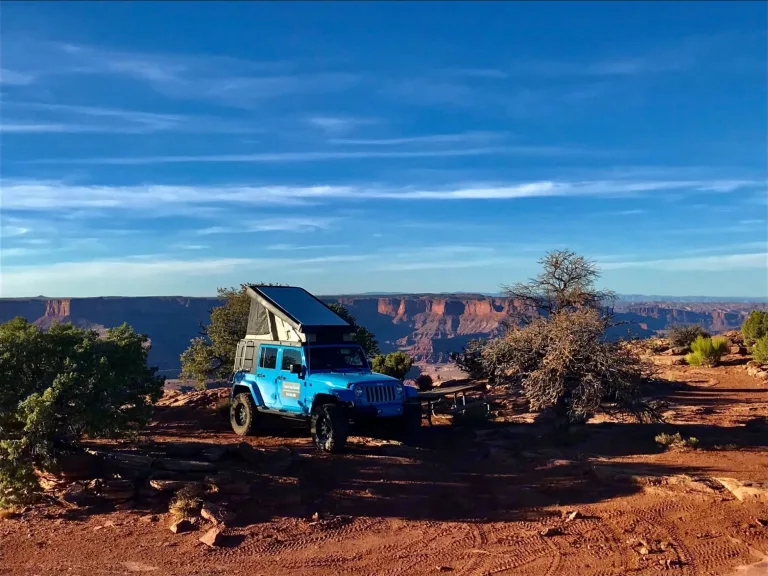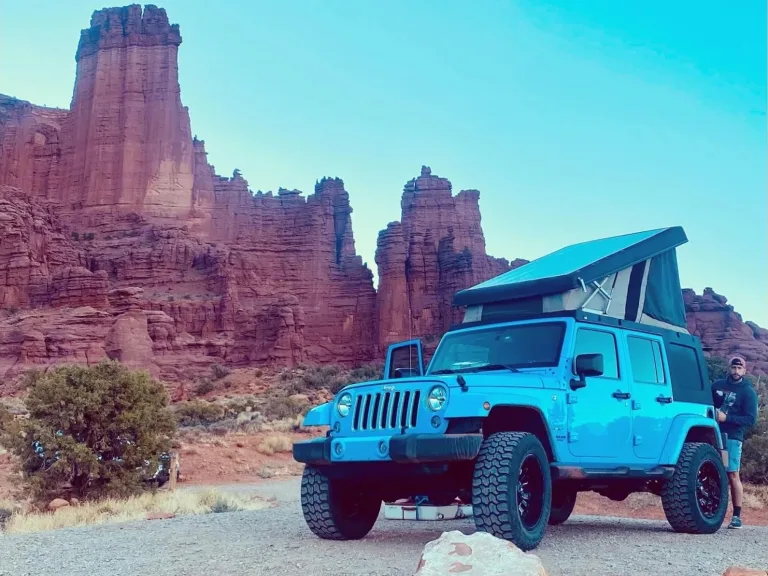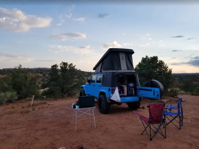 Jeep has a 3.5in lift, winter rated 35in all terrain tires , 30quart fridge and all your basic camping necessities