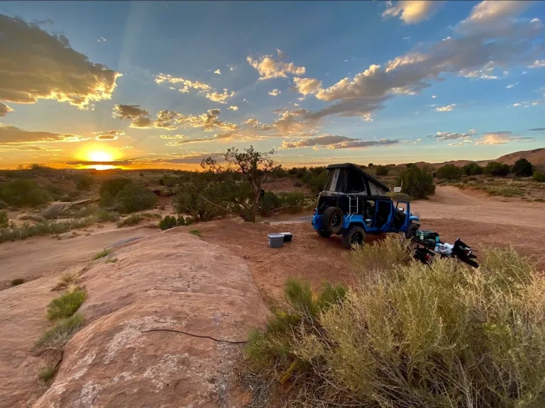 Ursa Minor J30 Hard top which has entry from inside or outside of the tent and a comfortable sleeping area inside of the wedge camper . Lightweight this setup is only about 120lbs heavier than a standard Jeep so drives great and gets pretty gas mileage