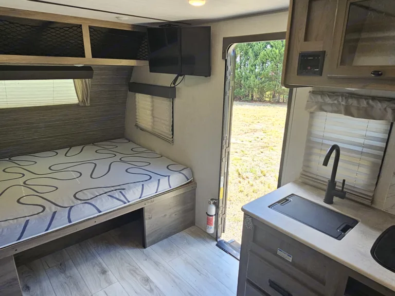 Meet your ideal getaway companion—this 2022 Forest River Surveyor 19Bhle combines comfort, style, and full functionality in a compact, towable size. Perfect for small families, couples, or first-time RVers, it balances smart design with home-like amenities.Key FeaturesSleeping ConfigurationTwin bunk beds (34" × 76") with a large window for natural light and ventilationConvertible dinette (upgrades to extra sleeping space)Queen bed in the front, complete with under-bed storageKitchen & DiningThree-burner high-output stove6 cu ft 12V refrigeratorStainless steel sink with cover for added prep spaceOverhead cabinets + pantry areaDinette seating for fourBathroomFull wet bath design: shower, toilet, and sink in one efficient spaceLiving AreaSpacious, open layout when slides outLED lighting throughoutSkylight over the shower adds brightness as well as airClimate & Convenience13,500 BTU air conditioner20,000 BTU furnace for year‑round comfortPower awning with LED lighting for evening enjoymentExterior storage compartmentStereo system with interior/exterior speakersUtilities & Power30-amp electrical service with shore power hookupWhy We Love ItThe 19Bhle’s bunkhouse layout is exceptional for families or extra guests