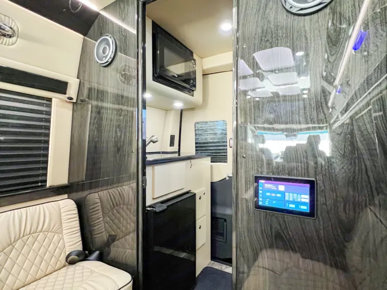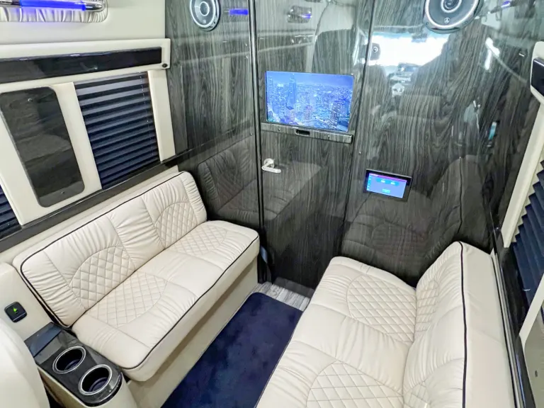 ..........KEY Features:Seating FOR 10: Ample room for you and your companions, ensuring everyone enjoys the journey in comfort and style.Plush Leather Interior: Sink into the sumptuous leather seats that exude opulence and provide optimal comfort for long rides.Entertainment Systems: Stay entertained throughout your journey with the state-of-the-art entertainment system, complete with smart TV, premium sound, wifi, and connectivity options.Panoramic Views: Experience the scenery with large, tinted windows offering breathtaking views while ensuring your privacy.Spacious Cargo Capacity: Whether it's luggage, golf clubs, event gear, or sports equipment, our van offers plenty of space to accommodate all your belongings.ON-Board Mini Kitchen: Experience the epitome of convenience on the road with our built-in mini-fridge and microwave, keeping your beverages cool and your snacks accessible.ON-Board Restroom: As you embark on your Ultimate Road Trip, leave behind your fear of frequent stops with our convenient toilet and sink.Smooth Ride: The van boasts advanced suspension and a powerful engine for a smooth and enjoyable ride.