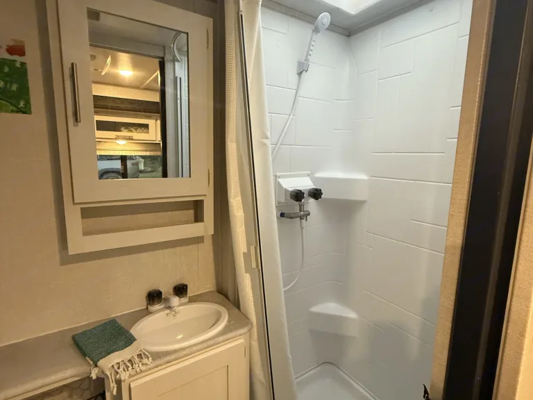 • Private queen bed • Convertible dinette • Spacious slide-out • Full bathroom with shower