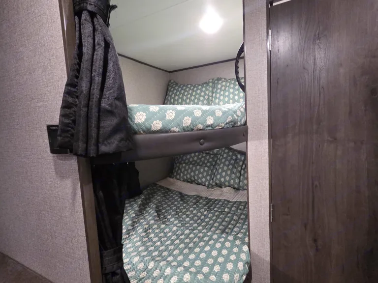 The 2021 Jayco Jay Flight SLX 8 264BH is a 29' 5" long travel trailer designed to sleep up to 8-9 people, featuring a front queen bed, a dinette and jackknife sofa for sleeping, and two full-size bunk beds in the rear. Key features include a fully equipped kitchen with a three-burner range and oven, a marine-grade toilet with a tub/shower, and ample exterior storage. The trailer also boasts Jayco's durable construction, including the Magnum Truss Roof System and I-Class cambered structural steel I-beams, alongside the mandatory Customer Value Package which adds amenities like a power awning, spare tire, and outside shower.