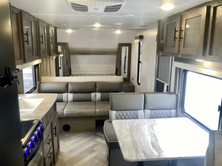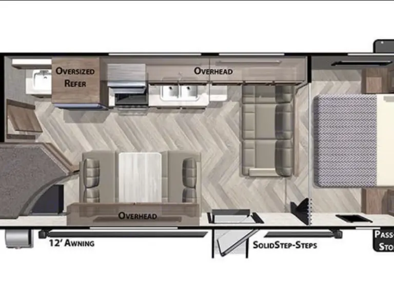 - Includes beds, kitchen, bathroom, and seating area