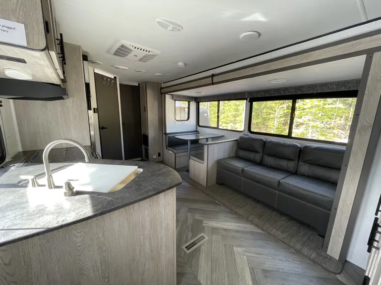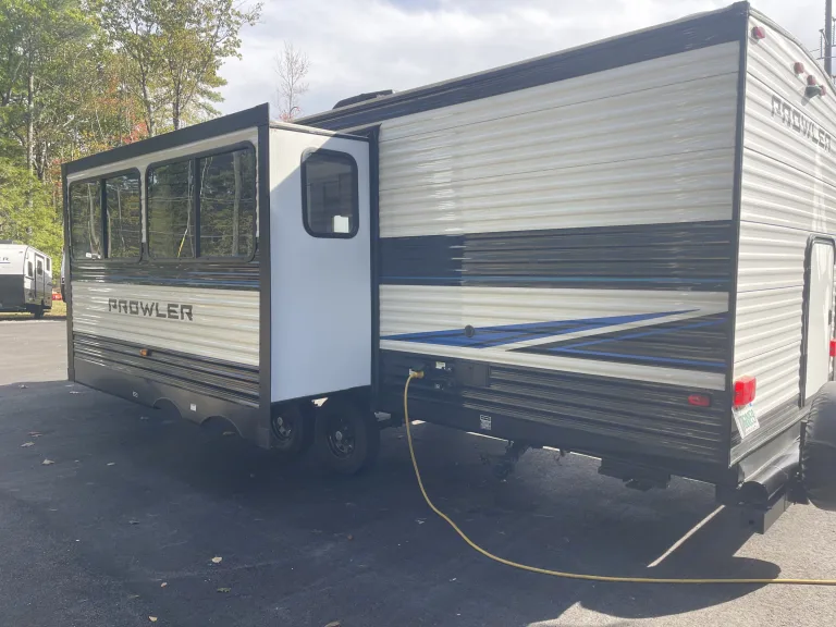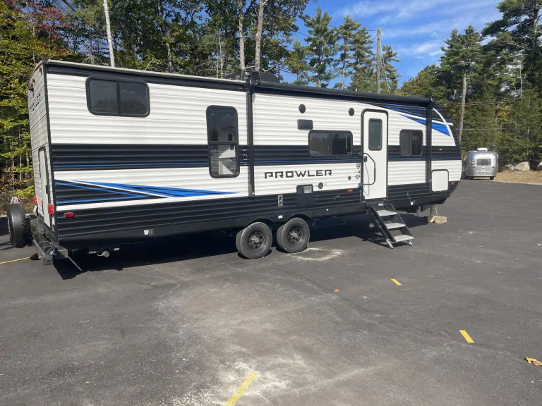2022 Heartland Prowler 271BR: Perfect for a family or two (sleeps 8, possibly up to 10 with small children), this large camper has plenty of space with privacy door for master bedroom. Full kitchen with 3 burner gas cooktop, oven, kitchen sink and ample counterspace. Full size refrigerator (electric) and microwave. Dinette and couch (slideout) in living space as well - both fold down to full beds. Bathroom with toilet, sink, shower and tub. Double over double bunks - bottom bunk folds up for extra cargo space for transit. Heat and air conditioning (AC requires 30 amp hook up). Dual axle for easy towing with a 1/2 ton pickup truck. Easy set-up with power jacks on each corner. Camper has a power awning and one slideout, which opens floorspace out nicely inside.