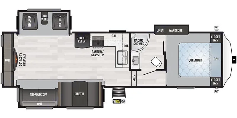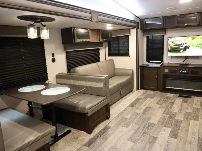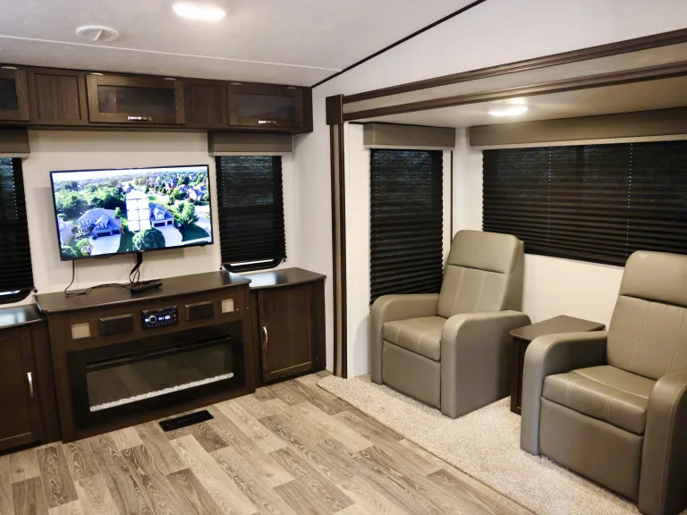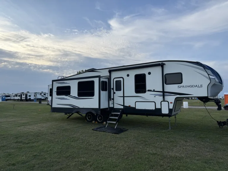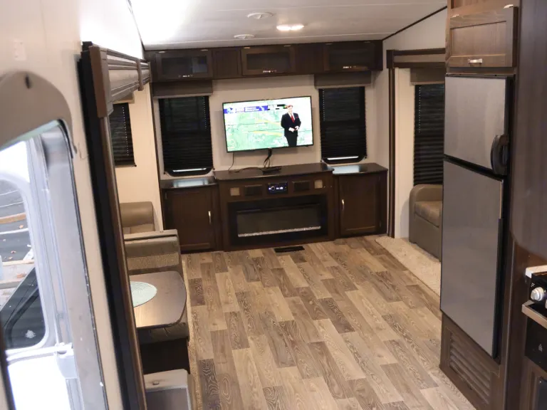 Springdale 253Fwre is a rear entertainment fifth wheel model known for its spacious living area with dual opposing slides. It features a large entertainment center as the focal point of the rear living space, often including a fireplace. The floorplan also includes a front master suite with a queen bed and a dual-entry bathroom.